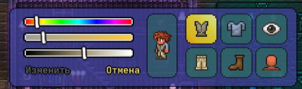 Изменения можно делать в неограниченном количестве и это не стоит ничего. Цвета настраиваются при помощи ползунков тона, насыщенности и яркости. Цвета применяются только на ту одежду, которую видно когда на игроке нет ничего. Чтобы изменить цвет брони, аксессуаров и декоративных предметов, нужно использовать красители.