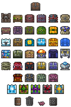 Хранилища (Storage items) — мебель, по которой можно нажать кнопку ⚷ Открыть/Активировать для открытия дополнительного инвентаря. В каждом хранилище всегда есть 4 ряда по 10 слотов в каждом (итого 40 слотов на одно хранилище). Эти предметы позволяют игроку освобождать место в его инвентаре. Их также можно использовать для сортировки предметов, например хранить в одном Сундуке только руду. Стационарные хранилища можно переименовывать, что помогает в организации хранилищ (подробнее об этом см. ниже).